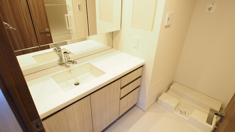 基本的な形状は変わりませんが、機能が異なります。三面鏡が付いたタイプ、蛇口がシャワーとなっているタイプ、鏡を壁に取り付け、洗面台とセパレートになっているタイプなどです。また、化粧をしやすいカウンタータイプもあるようです。さらに洗面台下部の収納スペースに、専用の電気温水器も設置できるタイプもあります。